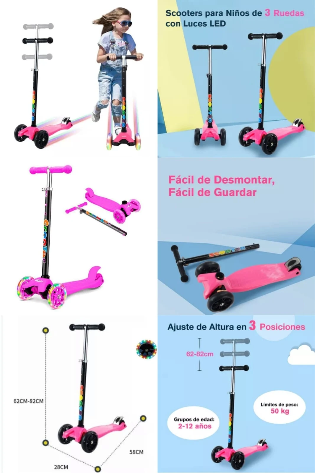 MONOPATIN ROSA Y NEGRO PLEGABLE + RUEDAS CON LUZ